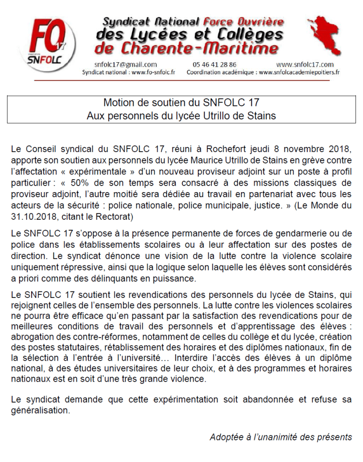 8 novembre 201818 novembre 2018snfolc17 image Motion du Conseil syndical du SNFOLC 17 en soutien aux personnels du lycée Utrillo de Stains en grève Partager : Cliquer pour partager sur Bluesky(ouvre dans une nouvelle fenêtre) Bluesky Cliquez pour partager sur Facebook(ouvre dans une nouvelle fenêtre) Facebook Cliquez pour partager sur WhatsApp(ouvre dans une nouvelle fenêtre) WhatsApp Cliquer pour partager sur X(ouvre dans une nouvelle fenêtre) X J’aime chargement… Similaire