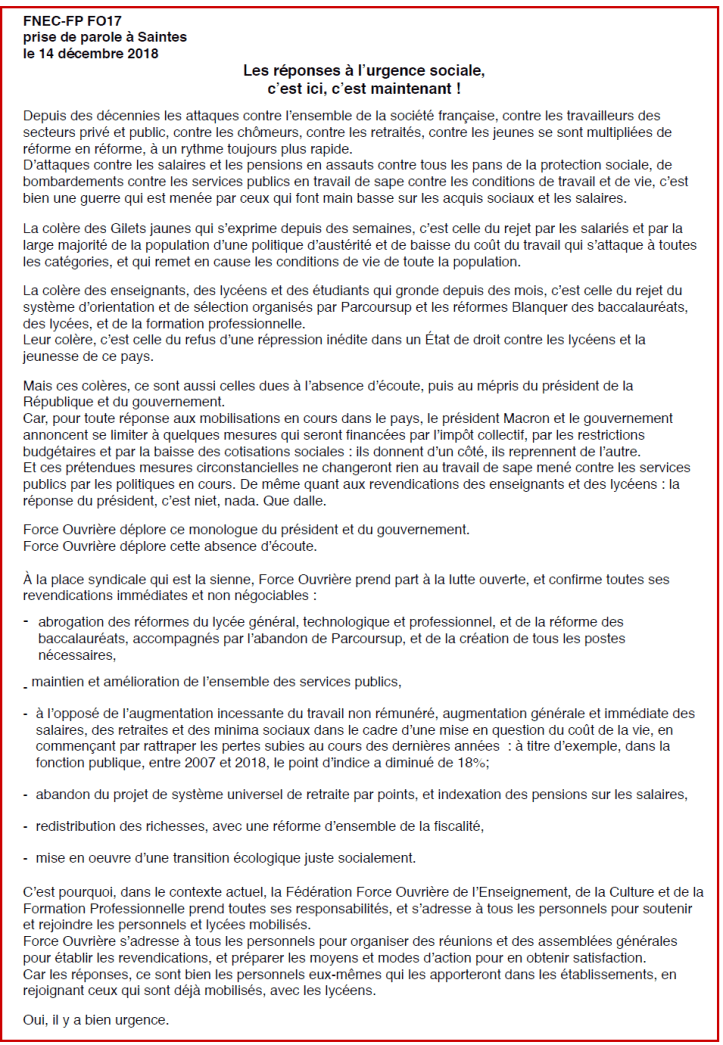- Jonzac : rassemblement devant le lycée à 8h, avec 200 présents environ. Prises de parole de deux élèves et de la FNEC. Les mobilisés sont partis en cortège pour rejoindre la manifestation de la CGT. Des gilets jaunes se sont joints aux lycéens. La manifestation s’est arrêtée devant la permanence du député Raphaël Gérard, qui a reçu une délégation de quatre personnes (CGT, lycéen, FNEC, gilet jaune). Ils ont ensuite été reçus par le sous-préfet. Les personnels du lycée de Jonzac se réuniront en AG lundi 17 décembre à 12h30.
