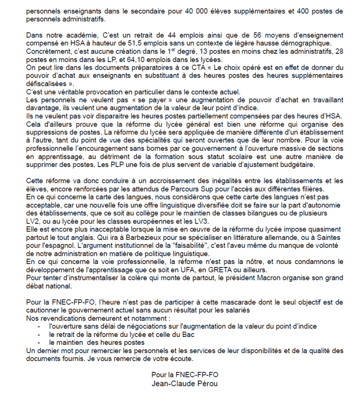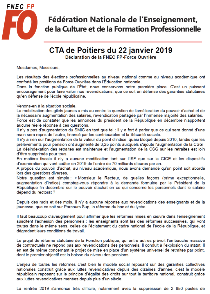 Le Comité Technique Académique s’est tenu mardi 22 janvier 2019, de 14h 30 à 19h 30.