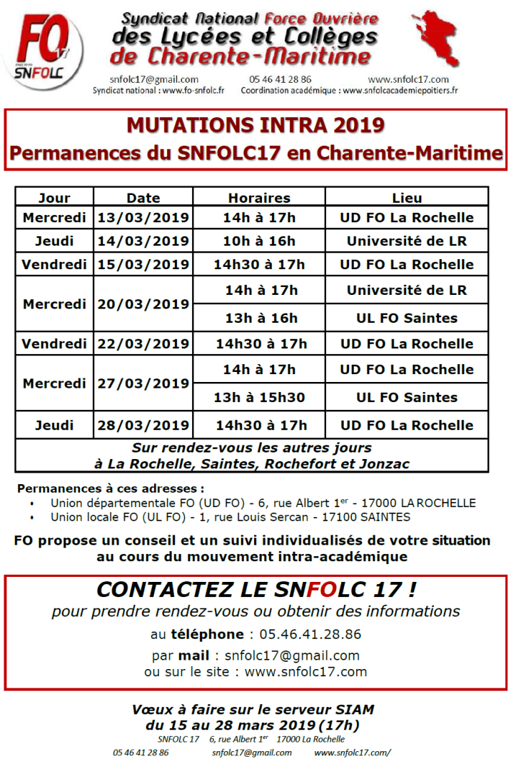 Permanences du SNFOLC 17 :