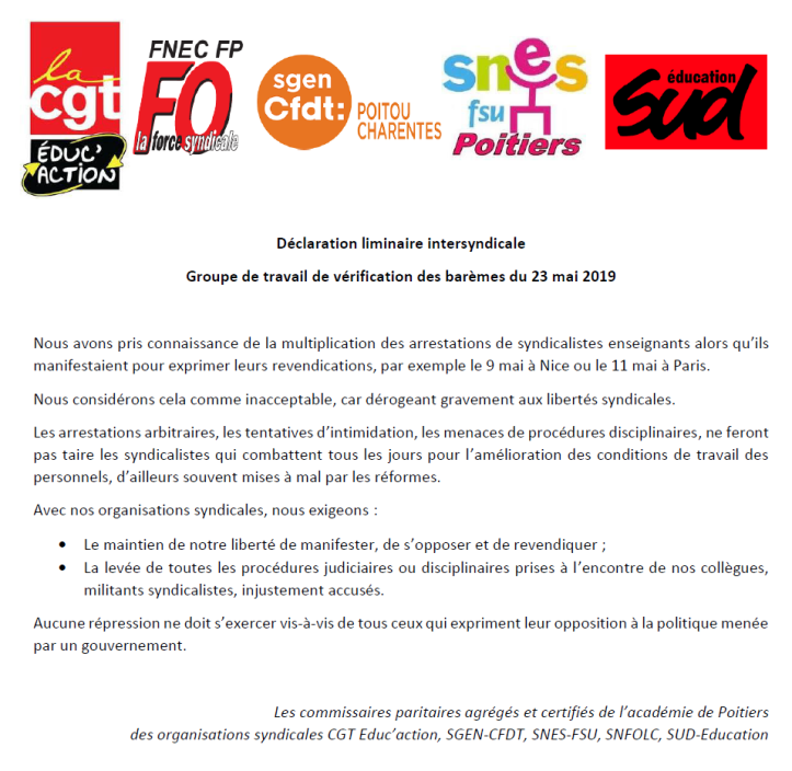 23 Mai 201923 Mai 2019snfolc17 Déclaration liminaire intersyndicale contre la répression Déclaration intersyndicale des commissaires paritaires lors du groupe de travail de vérification des barèmes jeudi 23 mai 2019. Partager : Cliquer pour partager sur Bluesky(ouvre dans une nouvelle fenêtre) Bluesky Cliquez pour partager sur Facebook(ouvre dans une nouvelle fenêtre) Facebook Cliquez pour partager sur WhatsApp(ouvre dans une nouvelle fenêtre) WhatsApp Cliquer pour partager sur X(ouvre dans une nouvelle fenêtre) X J’aime chargement… Similaire