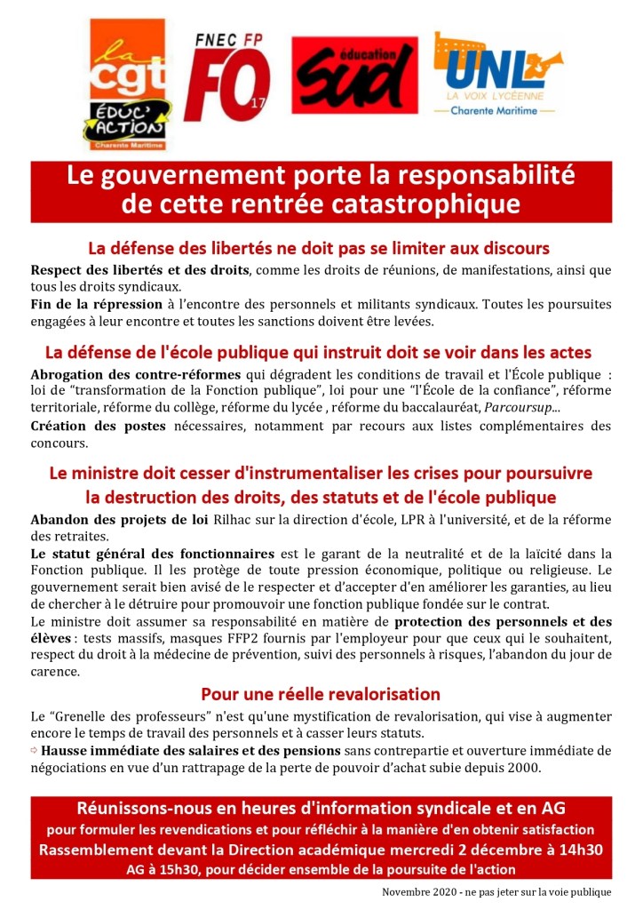 Une délégation sera reçue par la DASEN avant le rassemblement : n’hésitez pas à transmettre vos cahiers de revendications d’établissement à snfolc17@gmail.com pour qu’ils lui soient transmis directement.