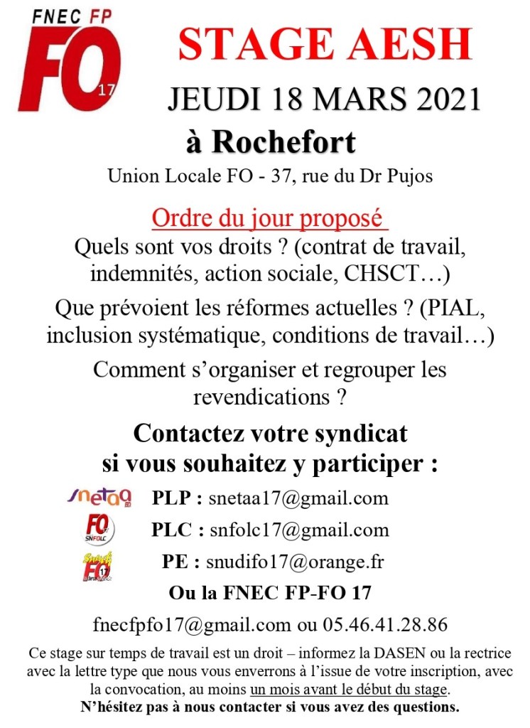 La FNEC FP-FO 17 organise un stage pour les AESH jeudi 18 mars à Rochefort. N’hésitez pas à nous contacter à l’adresse snfolc17@gmail.com si vous souhaitez vous y inscrire, que vous soyez syndiqué ou non.