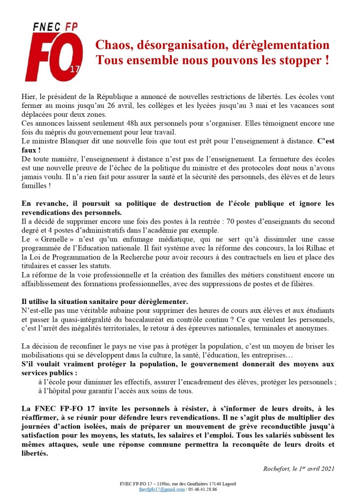 1 avril 20211 avril 2021snfolc17 image Chaos, désorganisation, dérèglementation : tous ensemble nous pouvons les stopper ! Partager : Cliquer pour partager sur Bluesky(ouvre dans une nouvelle fenêtre) Bluesky Cliquez pour partager sur Facebook(ouvre dans une nouvelle fenêtre) Facebook Cliquez pour partager sur WhatsApp(ouvre dans une nouvelle fenêtre) WhatsApp Cliquer pour partager sur X(ouvre dans une nouvelle fenêtre) X J’aime chargement… Similaire