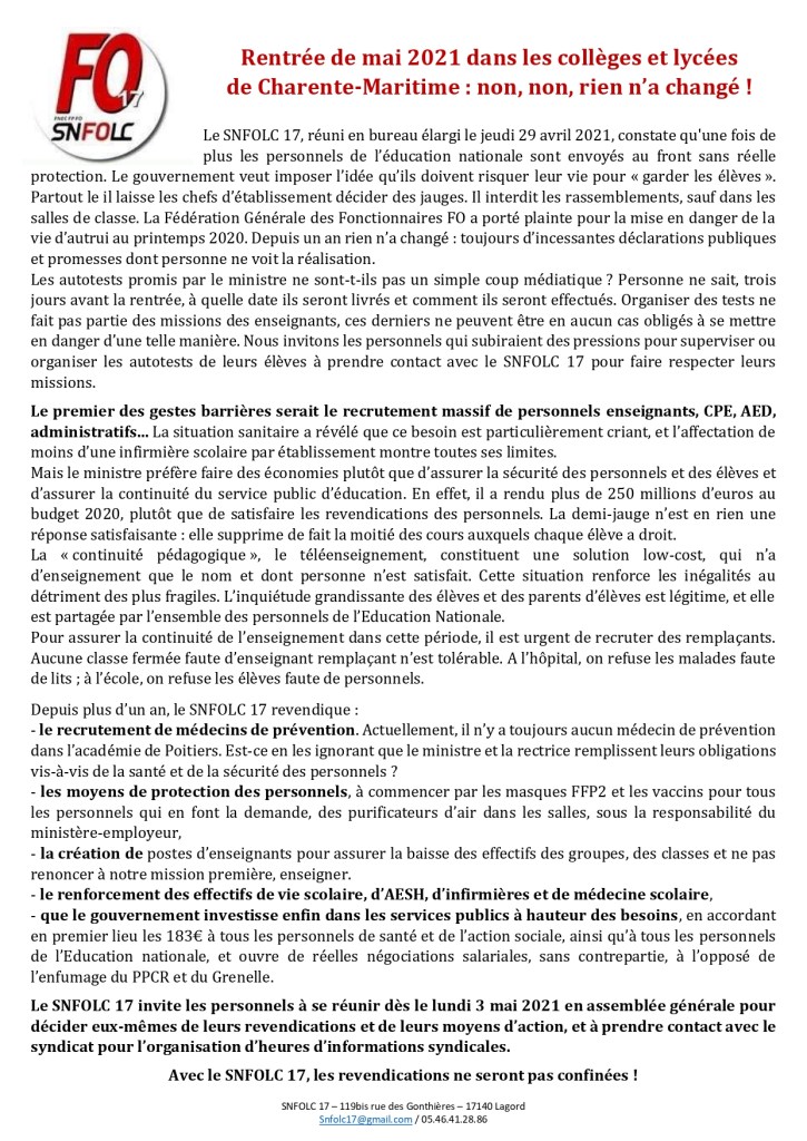 3 Mai 20213 Mai 2021snfolc17 image Rentrée du 3 mai : le ministre doit satisfaire les revendications ! Partager : Cliquer pour partager sur Bluesky(ouvre dans une nouvelle fenêtre) Bluesky Cliquez pour partager sur Facebook(ouvre dans une nouvelle fenêtre) Facebook Cliquez pour partager sur WhatsApp(ouvre dans une nouvelle fenêtre) WhatsApp Cliquer pour partager sur X(ouvre dans une nouvelle fenêtre) X J’aime chargement… Similaire