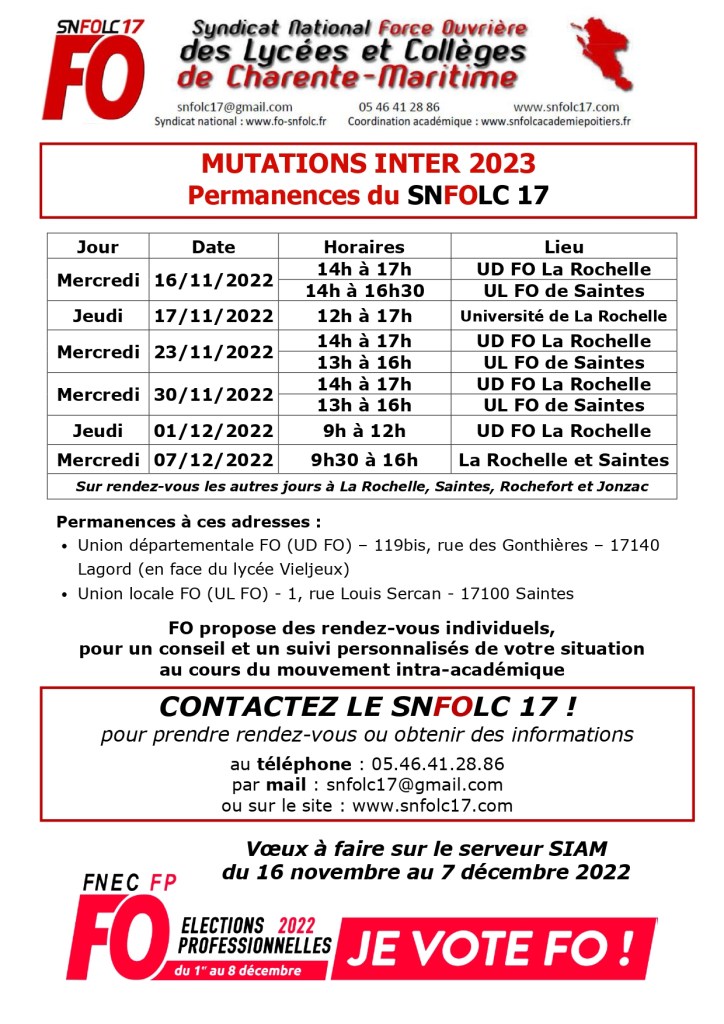 Le SNFOLC17 tient des permanences mutations dans le département, dont vous trouverez les horaires et villes sur le tableau en lien. Les permanences à l’Université de La Rochelle se tiendront dans le bâtiment d’Orbigny, avenue Henri Becquerel. Pour fixer un rendez-vous, contactez-nous par retour de mail ou par téléphone au 05.46.41.28.86, en laissant un message avec vos coordonnées (si nous sommes absents, nous vous recontacterons très rapidement). Si les créneaux des permanences ne correspondent pas à votre emploi du temps, merci de nous préciser vos disponibilités.