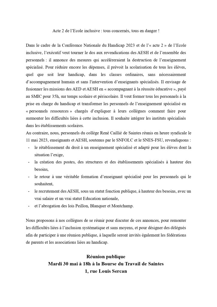 Les personnels du collège René Caillié de Saintes, enseignants et AESH, réunis en heure syndicale jeudi dernier ont adopté un appel qui invite leurs collègues des autres établissements, écoles, services à se réunir pour discuter de ces annonces, lister les problèmes liés à l’inclusion systématique et sans moyens, désigner des délégués pour participer à une