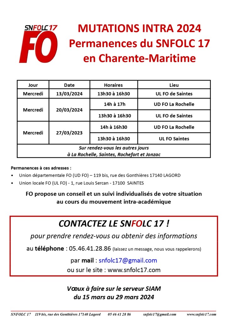 Pour notre académie, le serveur SIAM pour la saisie des vœux intra-académique 2024 sera ouvert du vendredi 15 mars 12h au vendredi 29 mars 12h. Cette année, comme lors des précédentes, le SNFOLC17 tiendra des permanences les mercredis 13, 20 et 27 mars (après-midi) dans les Unions locales et à l’Union départementale, pour vous informer et vous conseiller individuellement (cf. tableau des permanences). Des rendez-vous pourront aussi être pris sur Jonzac, Rochefort, Saintes ou à l’université de La Rochelle sur d’autres créneaux. Vous pouvez d’ores et déjà nous contacter pour prendre rendez-vous, par mail ou au 05 46 41 28 86.