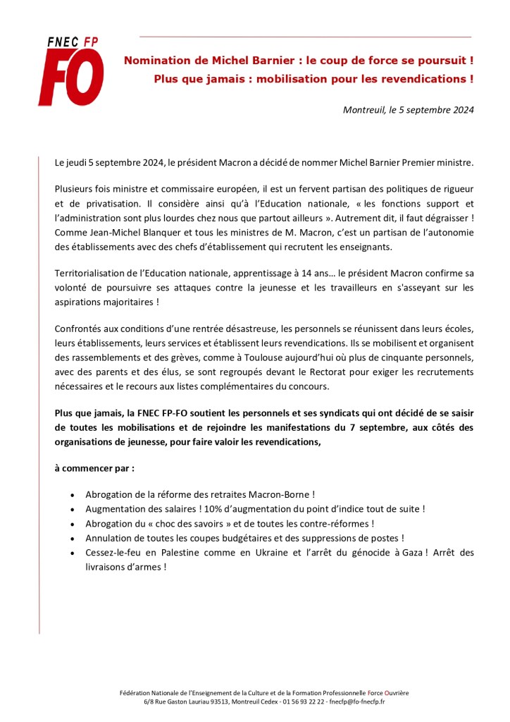 8 septembre 20248 septembre 2024snfolc17 Nomination de Michel Barnier : Le coup de force se poursuit ! Communiqué FNEC FP-FO Partager : Cliquer pour partager sur Bluesky(ouvre dans une nouvelle fenêtre) Bluesky Cliquez pour partager sur Facebook(ouvre dans une nouvelle fenêtre) Facebook Cliquez pour partager sur WhatsApp(ouvre dans une nouvelle fenêtre) WhatsApp Cliquer pour partager sur X(ouvre dans une nouvelle fenêtre) X J’aime chargement… Similaire