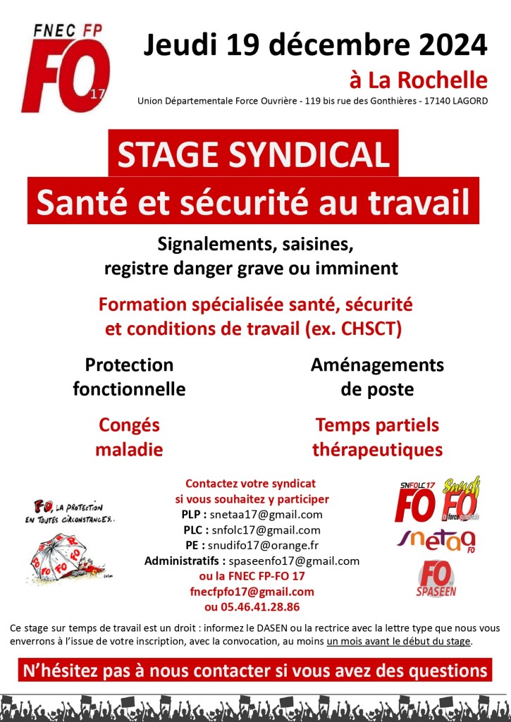 La FNEC FP-FO 17 organise un stage « santé et sécurité au travail » jeudi 19 décembre, à l’UD de La Rochelle. Il portera sur les signalements de dangers, les droits des personnels, les instances, les dispositifs et congés et les moyens d’action.