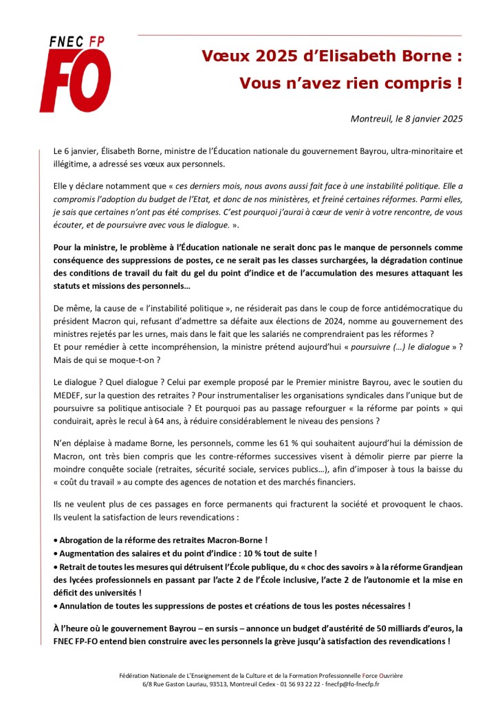 12 janvier 202512 janvier 2025snfolc17 image Voeux de la ministre Borne : vous n’avez rien compris Partager : Cliquer pour partager sur Bluesky(ouvre dans une nouvelle fenêtre) Bluesky Cliquez pour partager sur Facebook(ouvre dans une nouvelle fenêtre) Facebook Cliquez pour partager sur WhatsApp(ouvre dans une nouvelle fenêtre) WhatsApp Cliquer pour partager sur X(ouvre dans une nouvelle fenêtre) X J’aime chargement… Similaire