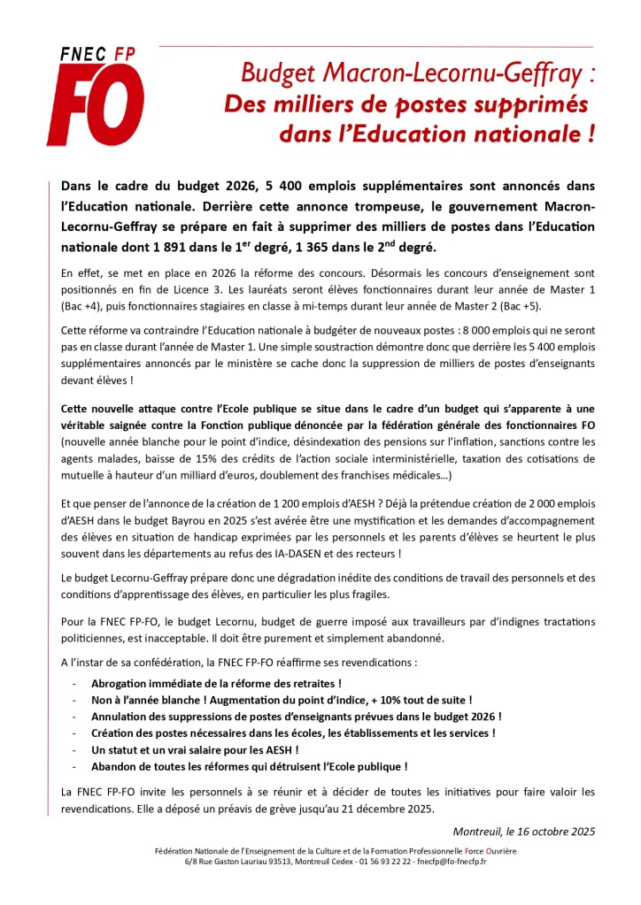 17 octobre 202517 octobre 2025snfolc17 image Budget Macron, Lecornu, Geffray : des suppressions de postes inacceptables ! Partager : Cliquer pour partager sur Bluesky(ouvre dans une nouvelle fenêtre) Bluesky Cliquez pour partager sur Facebook(ouvre dans une nouvelle fenêtre) Facebook Cliquez pour partager sur WhatsApp(ouvre dans une nouvelle fenêtre) WhatsApp Cliquer pour partager sur X(ouvre dans une nouvelle fenêtre) X J’aime chargement… Similaire