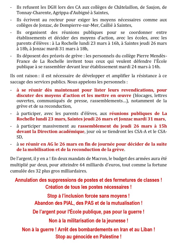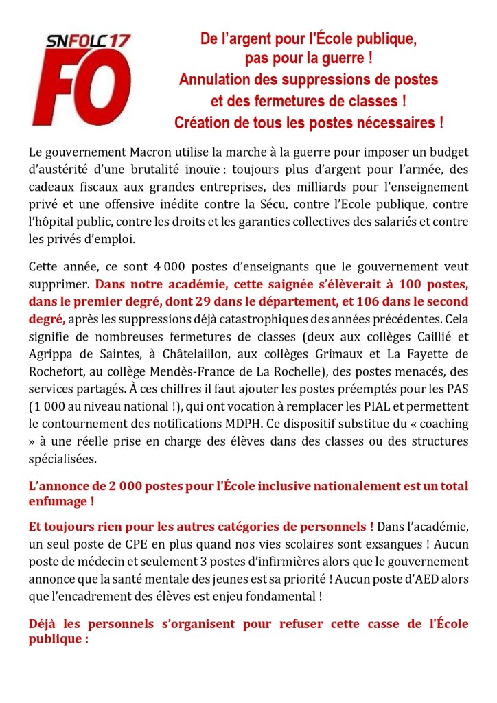 Il y a 4 heures 22 mars 202622 mars 2026snfolc17 De l’argent pour l’École publique, pas pour la guerre ! Rassemblement devant PMF mardi 24 mars et devant la DSDEN jeudi 26 mars… et discutons de la suite ! Partager : Partager sur Bluesky(ouvre dans une nouvelle fenêtre) Bluesky Partager sur Facebook(ouvre dans une nouvelle fenêtre) Facebook Partager sur WhatsApp(ouvre dans une nouvelle fenêtre) WhatsApp Partager sur X(ouvre dans une nouvelle fenêtre) X J’aime chargement… Similaire