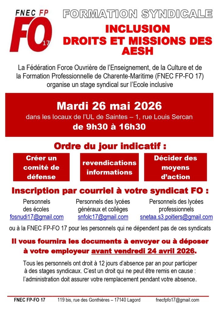 Lors du stage « Ecole inclusive, droits et missions des AESH » du 2 avril, les participants ont adopté un appel à constituer un comité départemental de défense des AESH et de l’enseignement spécialisé et adapté. Ils proposent de se réunir de nouveau le mardi 26 mai à la Bourse du travail de Saintes afin de s’organiser. La FNEC FP-FO 17 a déposé une nouvelle formation syndicale pour pouvoir discuter des revendications et des moyens d’action, ouvert à tous, syndiqués FO ou non et non-syndiqués.